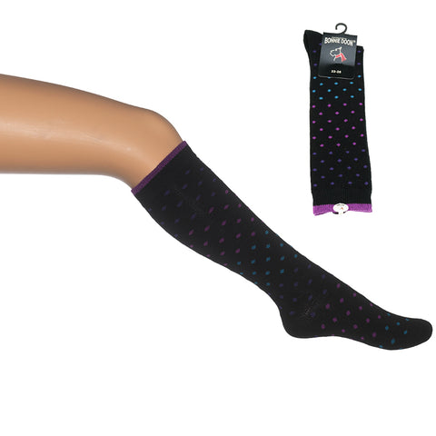 Die BONNIE DOON Kniestrümpfe BN653523 bringen mit ihrem verspielten Pünktchen-Muster in Lila, Petrol und Fuchsia ein Lächeln in den Alltag. Bequem und stilvoll in Schwarz, sind sie der perfekte Begleiter für fröhliche, aktive Tage.