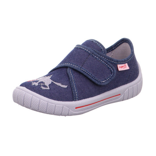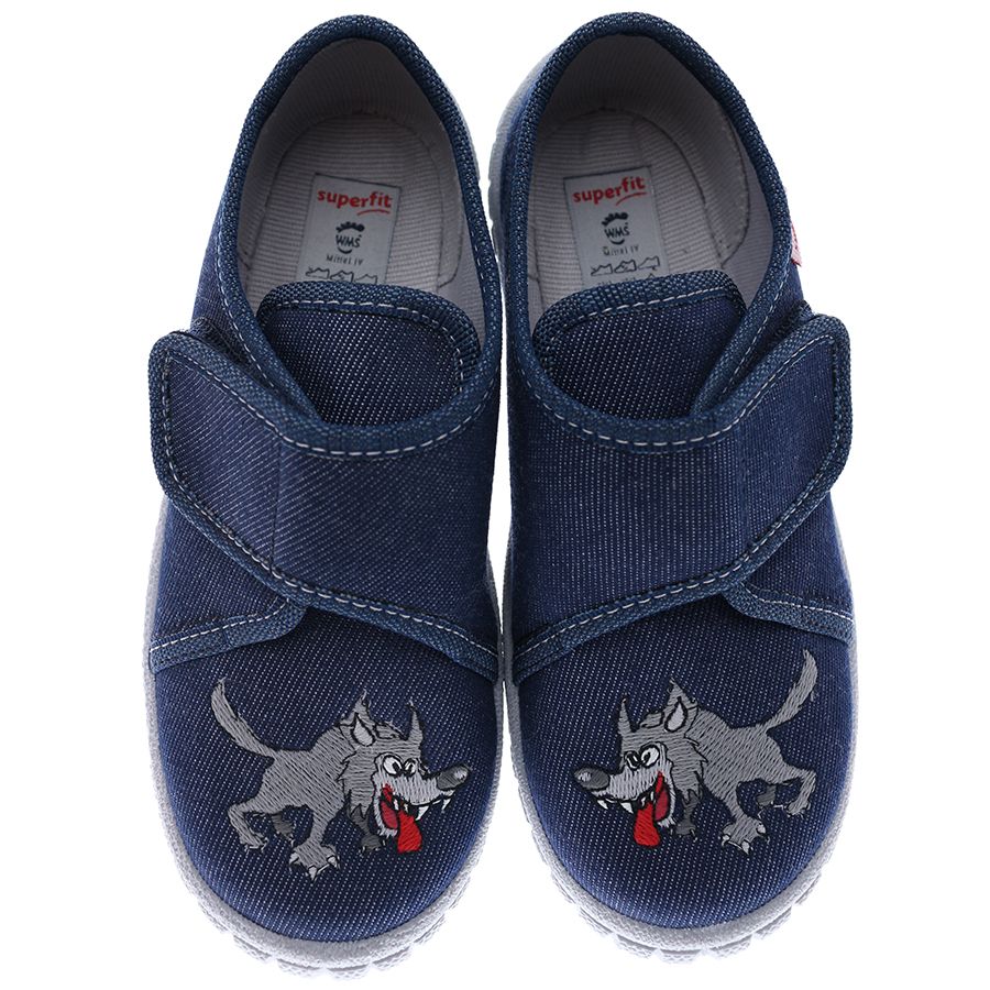 Diese bequemen SUPERFIT Hausschuhe, Modell BILL 278-802, in Jeansblau mit Wolf-Motiv und praktischem Klettverschluss, bieten perfekten Komfort für kleine Abenteurer. Ideal für Jungen, die ein bequemes und stilvolles Paar Hausschuhe brauchen.